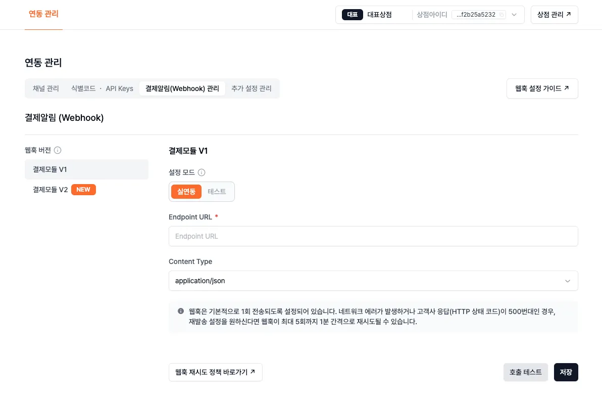 웹훅을 통해 결제 정보를 통보받을 URL을 설정하는 과정은 다음과 같습니다.